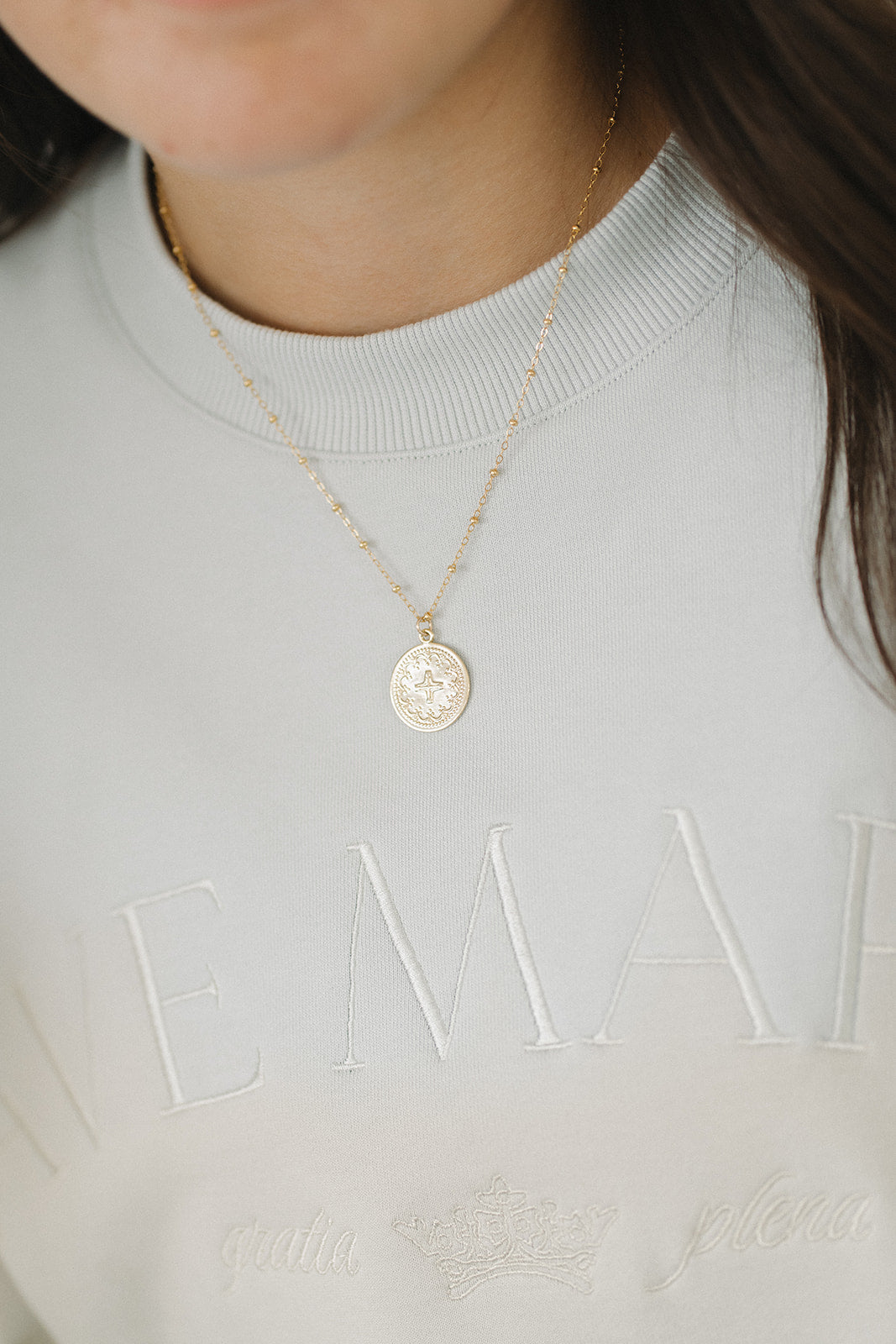 Our Ave Maria Crewneck is a soft, dusty blue monochrome sweatshirt embroidered with the words “Ave Maria, Gratia Plena” — Hail Mary, full of grace in latin.