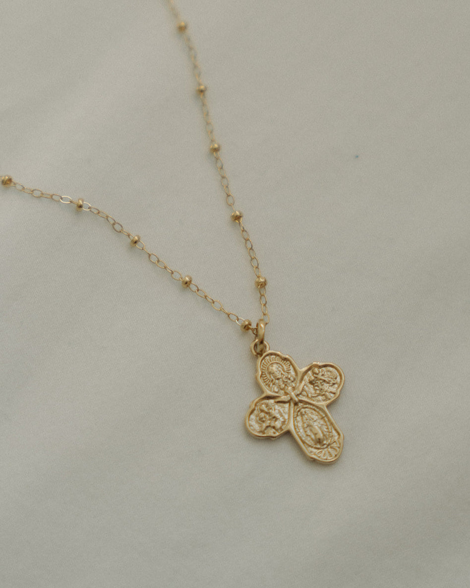 The Four-Way Cross Necklace brings together four beloved Catholic devotions in one timeless piece—a wearable reminder of God’s love and protection. The Sacred Heart of Jesus, St. Joseph, St. Christopher, and the Miraculous Medal are all united in this powerful cross, with the Holy Spirit at the center, symbolizing faith, guidance, and grace surrounding you wherever you go.
