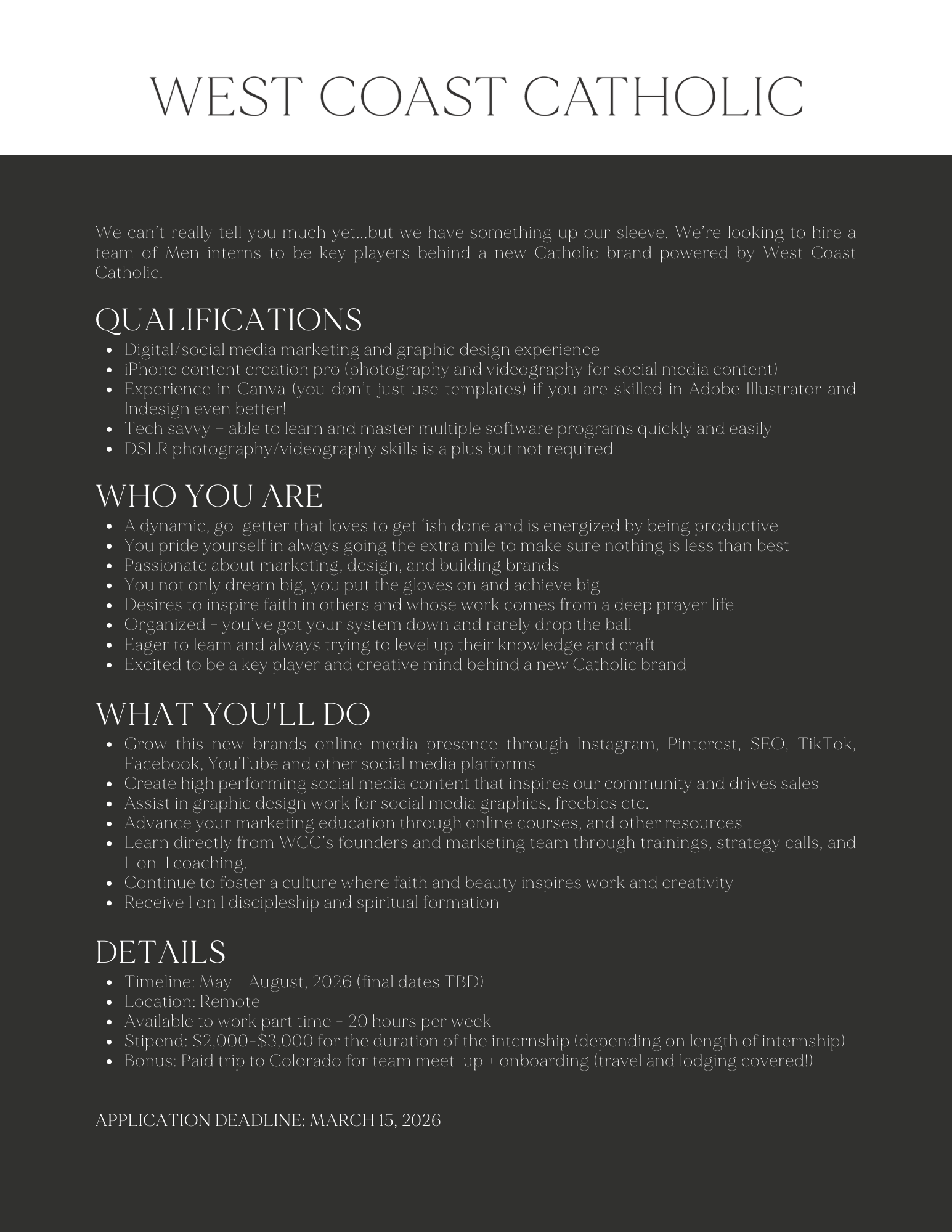 We’re looking to hire a team of Men interns to be key players behind a new Catholic brand powered by West Coast Catholic. See below for more details about the position.