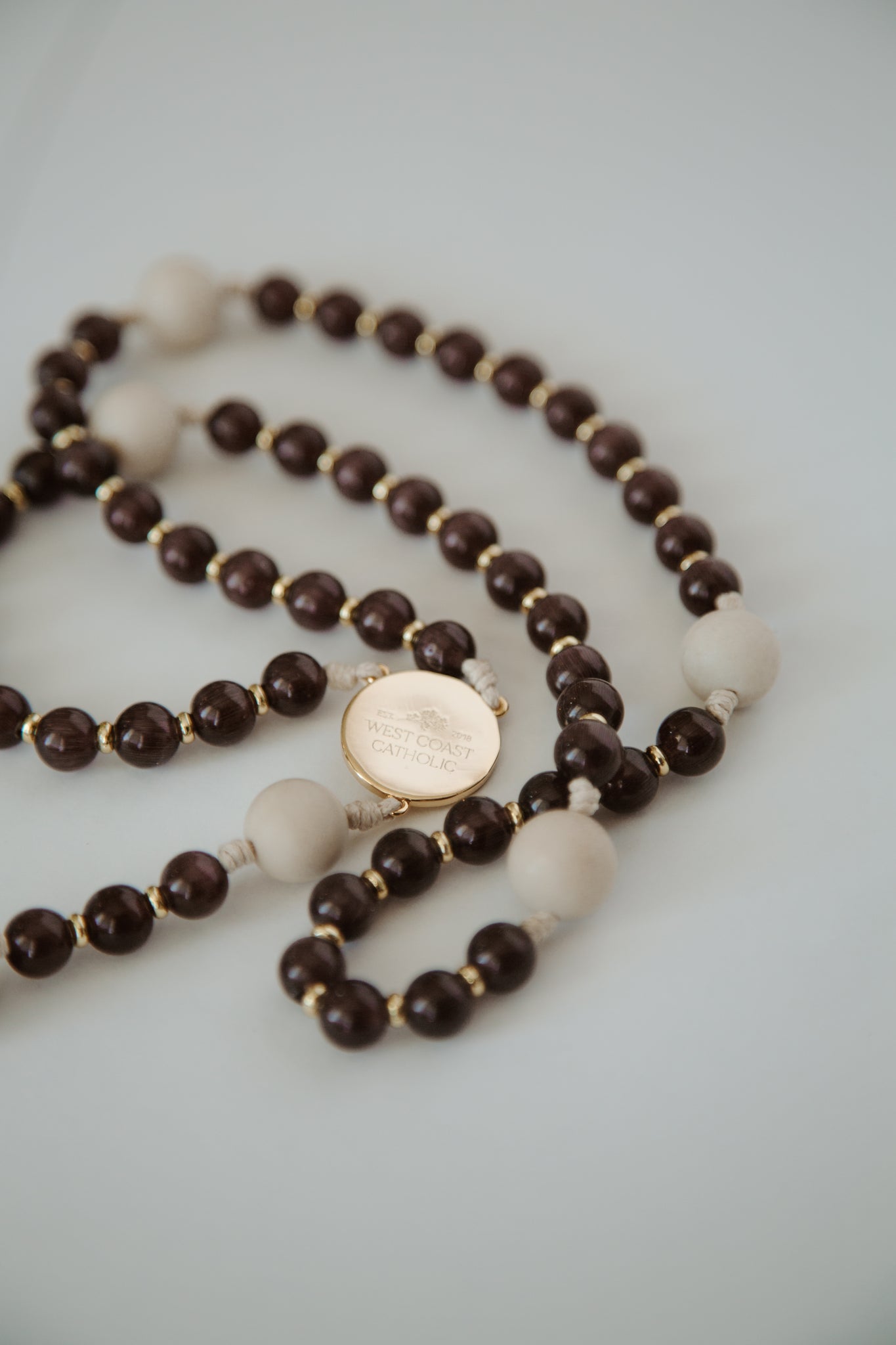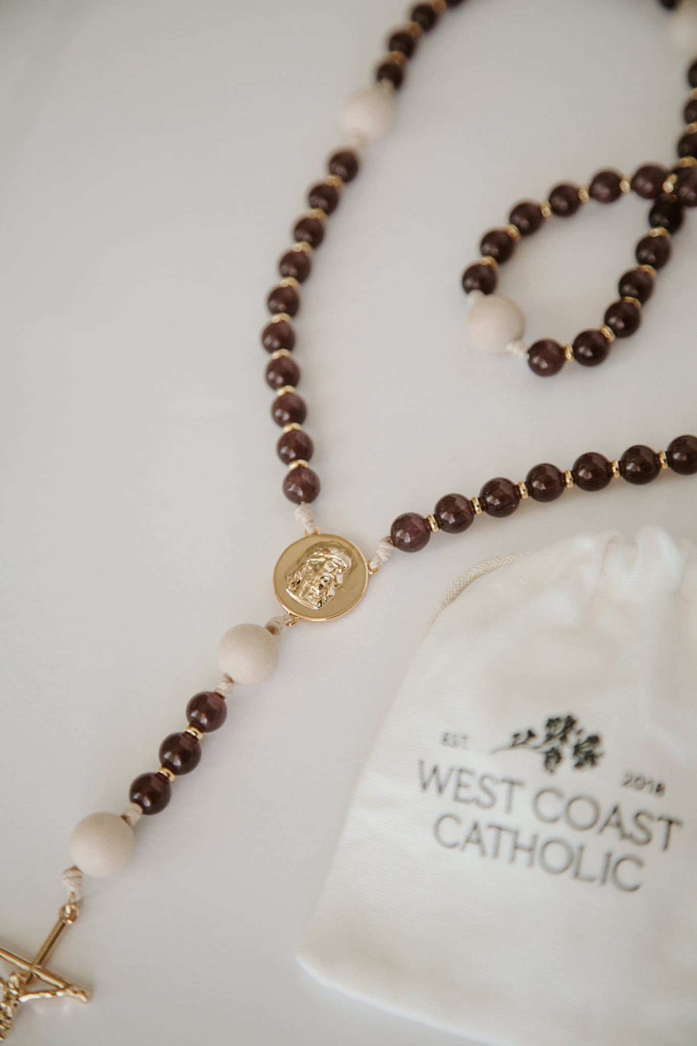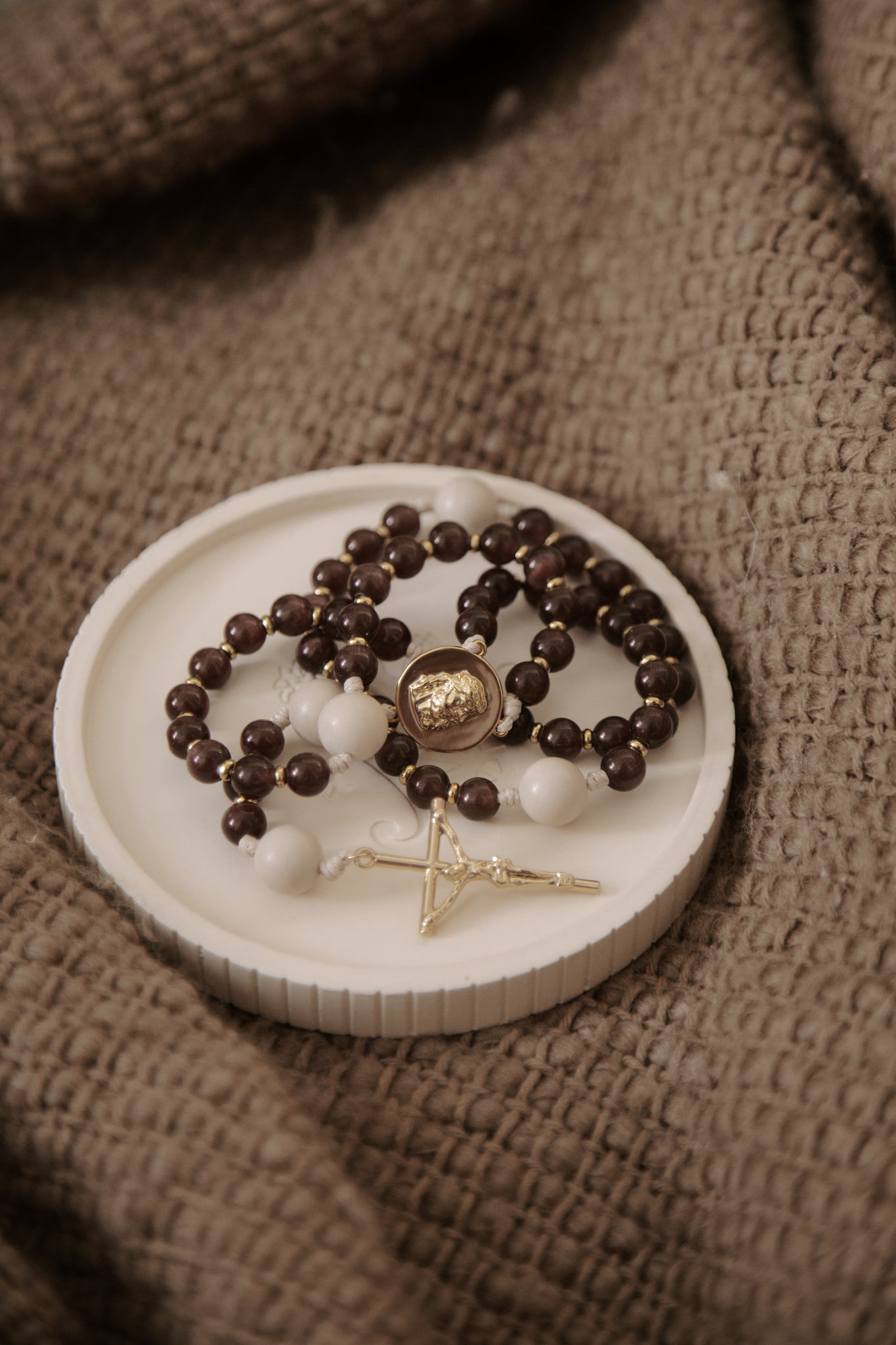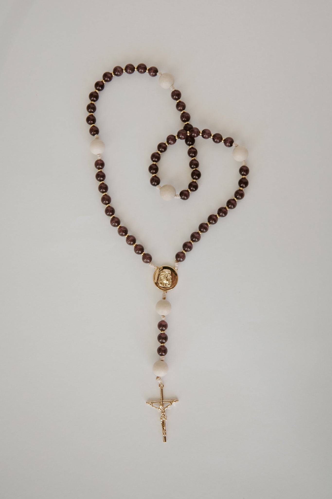 - Beads vary by rosary style between natural gemstone, wood and metal.