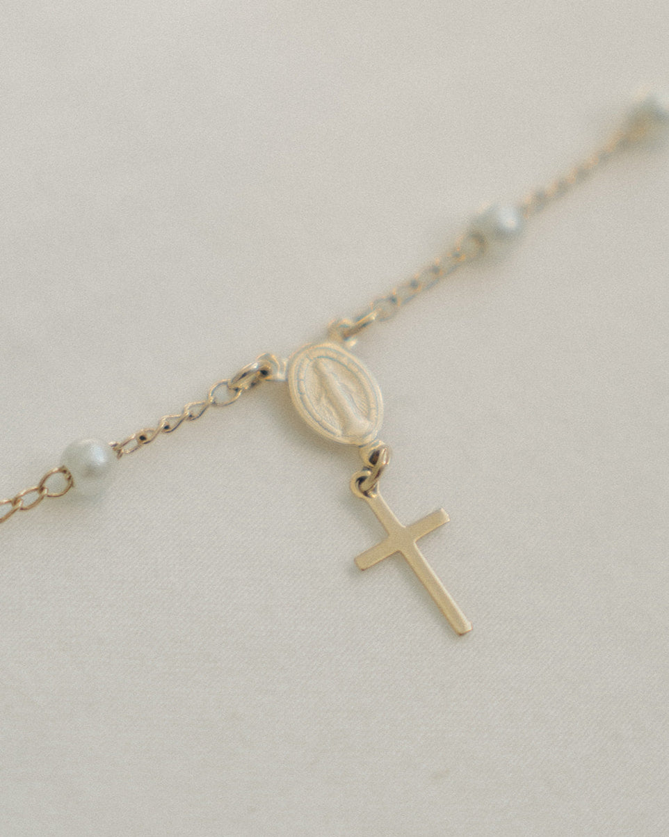 Delicate, timeless, and deeply meaningful, the Pearl Rosary Bracelet is more than just jewelry—it’s a wearable prayer tool. Crafted with care, this dainty miniature rosary rests gracefully on your wrist, allowing you to carry moments of prayer and reflection wherever you go.